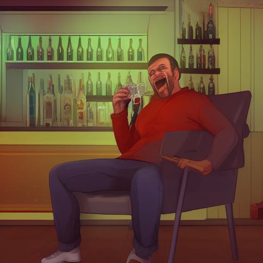 - “A laughing man sitting in a chair drinking from a bottle in a bar” – This is a specific subject matter, which will influence the overall composition and mood of the image being generated. The laughing man sitting in a bar drinking from a bottle creates a sense of leisure and relaxation, but also hints at the potential for danger and violence.