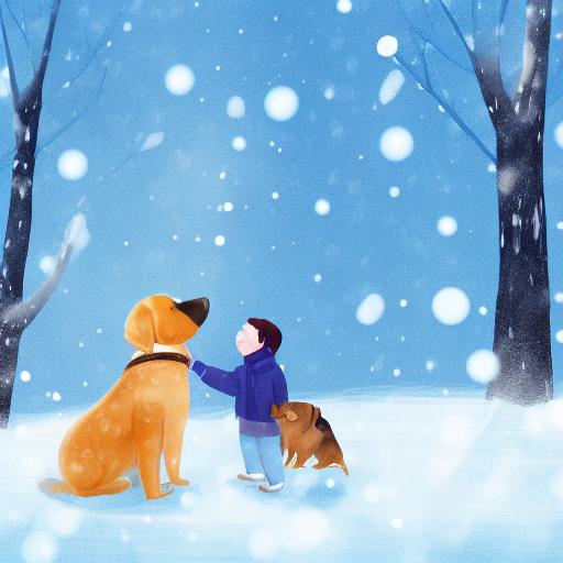 Little boy standing next to a dog in the snow