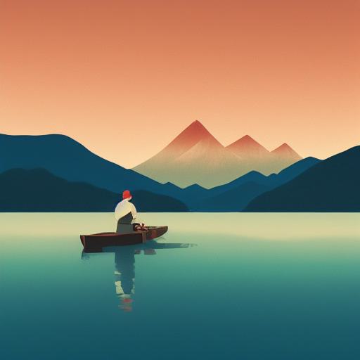 This AI image prompt includes several key components that help to shape the final image generated by an artificial intelligence algorithm. First, the prompt specifies a man on a boat on a lake, with mountains in the background. This creates a clear visual scene for the AI algorithm to work with, providing a basic framework for the image.