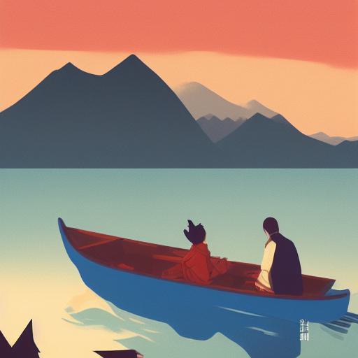 Man on the boat on lake with mountains in the background