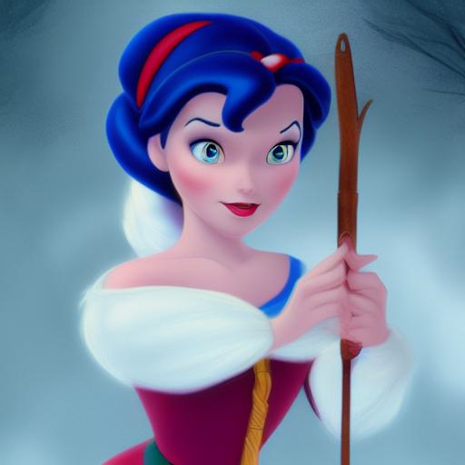 The inclusion of a wand in the prompt suggests a specific story or narrative for the image, such as a magical or enchanted forest setting, or a fairy tale-inspired scene with Snow White using the wand to cast spells or perform other magical feats. The wand might be a central focus of the image, with Snow White holding it prominently in the foreground, or it might be more subtly incorporated into the scene as a prop or accessory. The wand could add a sense of whimsy or fantasy to the image, and suggest a specific mood or theme.