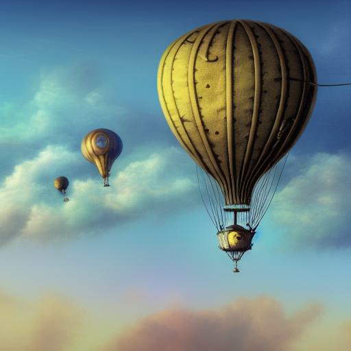 Melancholic detail steampunk art of a mechanical airship flying in the blue sky