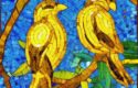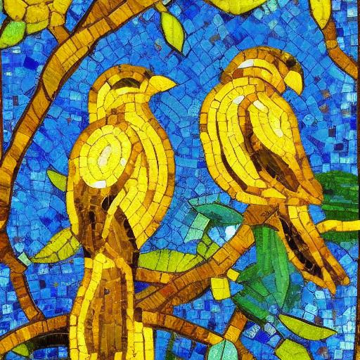 The first part of the prompt is “mosaic of two birds sitting on top of a tree branch.” This specifies the subject matter of the image, which is a mosaic representation of two birds sitting on a tree branch. The use of the word “mosaic” suggests that the birds will be made up of smaller pieces of glass or other materials. Additionally, the use of “two birds” and “tree branch” indicates the composition and placement of the birds within the image.