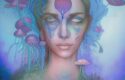 - A woman sitting on a mushroom in a mystical forest.