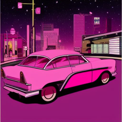 Retro pink car driving down a street at night