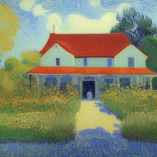 The impressionism painting of the house and a garden with beautiful flowers