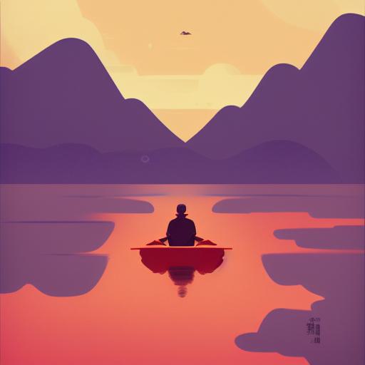 The man in the boat on a lake with mountains