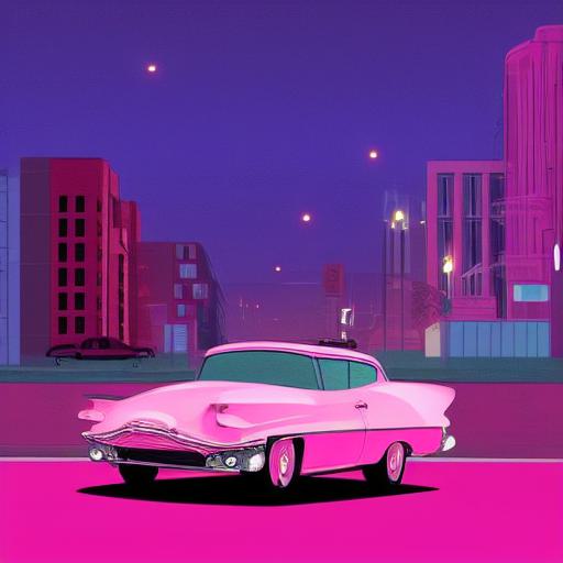 The pink car driving on a street at night