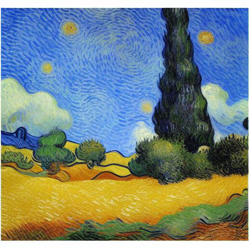 Additionally, the prompt mentions “instagram” and “post-impressionism,” which suggests that the image may have a modern or contemporary feel. Furthermore, the prompt includes “cypresses and hills, cypresses, van gogh painting,” which provides a more precise description of the elements that should be included in the generated image, such as the wheat field, cypress trees, and hills.