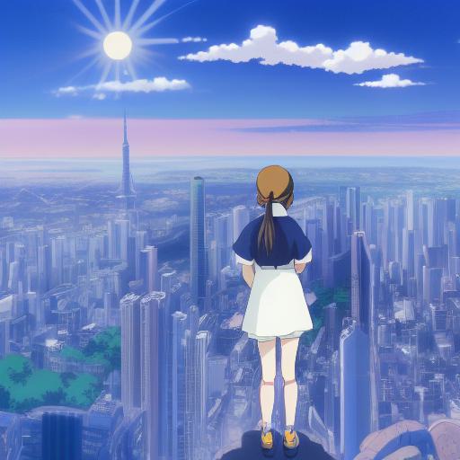 4. “The school girl stands on top of a skyscraper, gazing down at the bustling city below.” – This provides a specific pose and action for the school girl, indicating that she should be standing on top of a skyscraper and looking down at the city.
