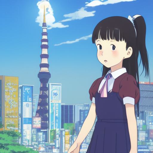 This stunning anime portrait from Studio Ghibli captures a school girl in front of the vibrant Tokyo cityscape in an ultra wide-angle shot. The school girl stands tall in the center