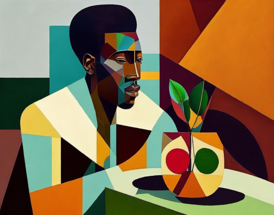 Prompt Inspired by Promptify: earthy tone, cubism painting of a beautiful man sitting at a table with fruit trees, a cubist painting by Bernard Accama, tumblr, geometric shapes, multiple perspectives, cubists love it, cubist painting, Picasso style