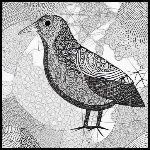 A black and white drawing of a bird