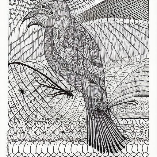 A black and white drawing of a bird