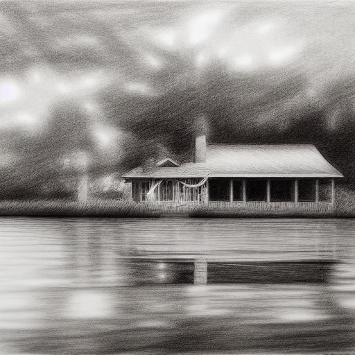 A black and white drawing of a house by a lake