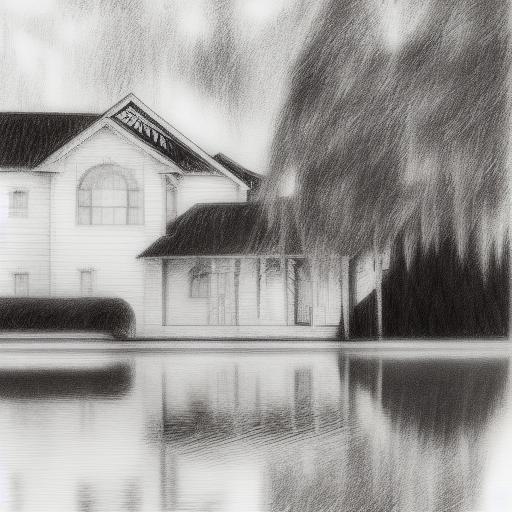 A black and white pencil drawing of a house by a lake
