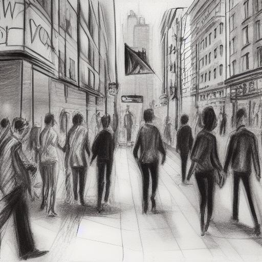 Firstly, the prompt specifies that the image should be a “charcoal painting of people walking down the city street”. This sets the overall theme and subject matter for the generated image. Charcoal is a medium that is often associated with expressive and dramatic art, while the subject of people walking down a city street implies movement, energy, and a busy urban environment.