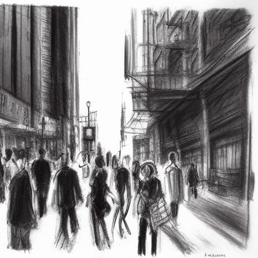 A charcoal painting of people walking in a city street