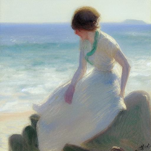 - “of a woman sitting on a rock by the ocean”: This provides a specific subject matter for the image, which the AI model should focus on. The inclusion of the ocean and the rock suggests that the woman is likely in a natural setting, which further helps to guide the AI model on what kind of environment to create.