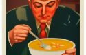 About A man in front of a bowl of soup