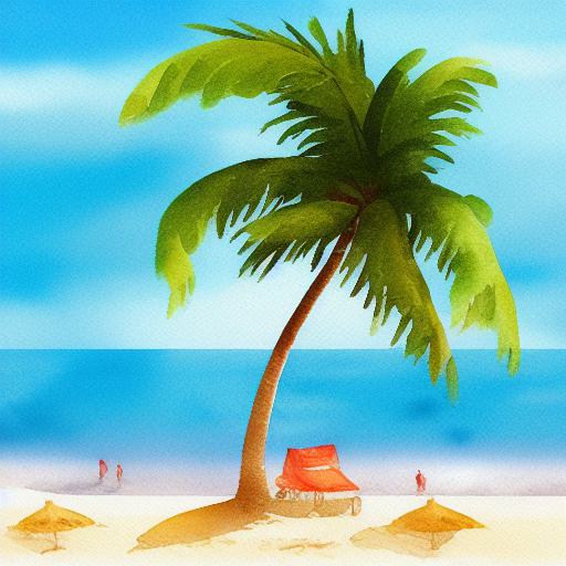 A painting of a beach scene with a palm tree