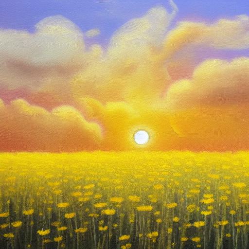 A painting of a bunch of yellow flowers in a field with sunrise sky