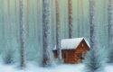 About A painting of a cabin in a snowy forest with trees