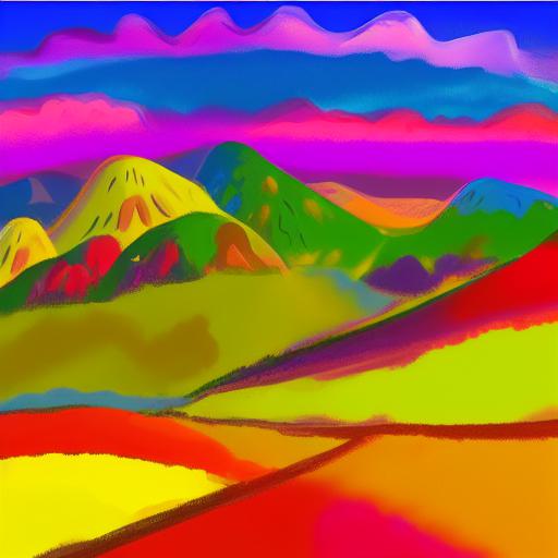 A painting of a colorful landscape with mountains and trees