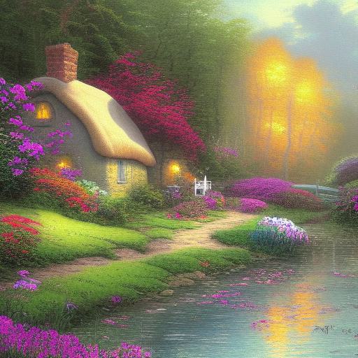 A painting of a cottage by a river with vivid flowers