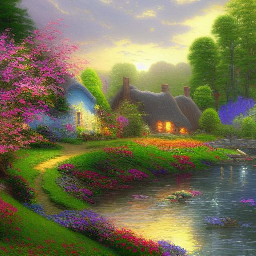 A painting of a cottage by a river with vivid flowers