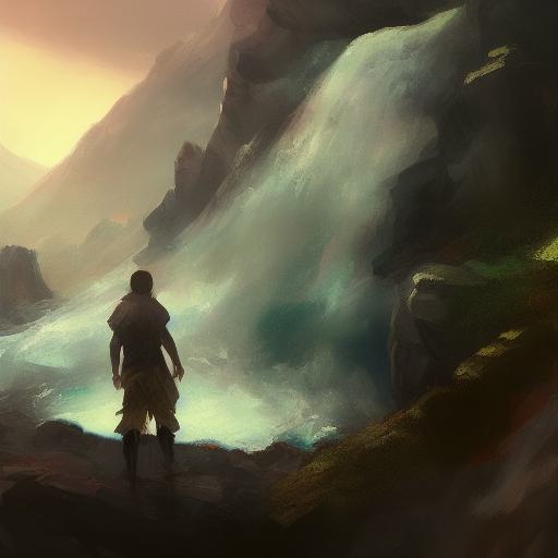 Finally, the prompt mentions “concept world art”, which implies a unique and imaginative world or setting for the artwork. This detail encourages the AI algorithm to think beyond a simple representation of a man standing in front of a waterfall, and to explore more fantastical and imaginative elements in the image.