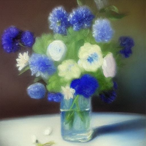 Firstly, the prompt sets the scene by describing a painting of beautiful blue flowers in a vase on a table. This provides the basic composition of the painting, which is a still life of flowers in a vase. The use of the word “beautiful” suggests that the flowers should be depicted in a way that is aesthetically pleasing to the viewer.