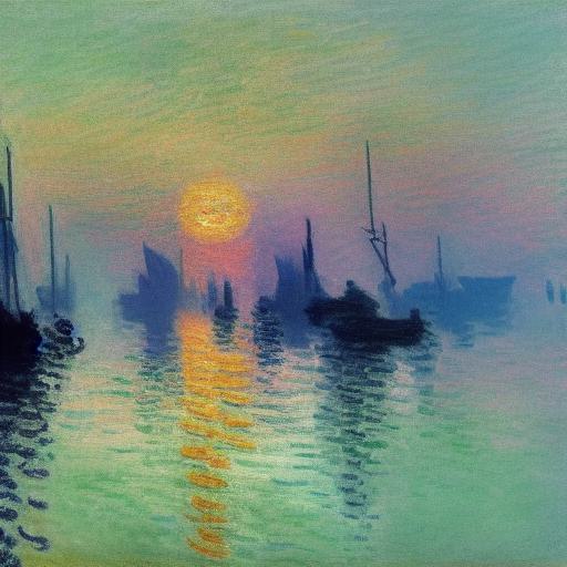 A painting of several boats in a body of water at sunset