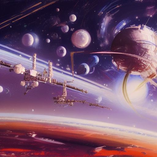 A painting of space station with stars and planets in the background