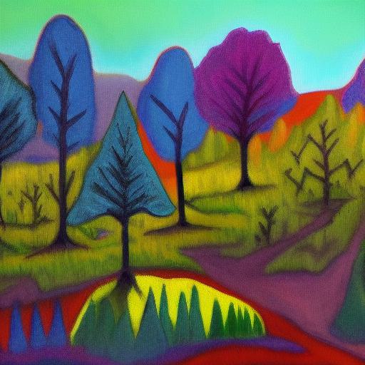About A painting of trees and shrubs in a field