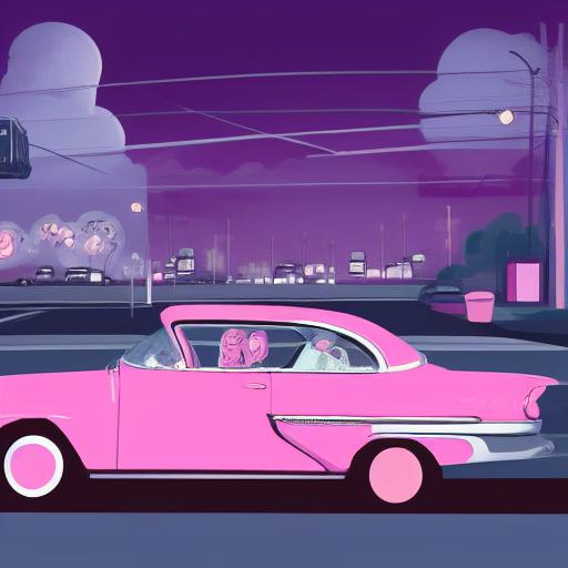 A pink car driving down a street at night