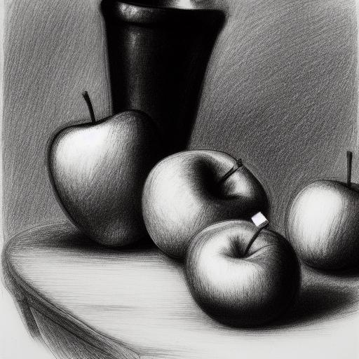 Black and white pencil drawing of a vase and apples on a table