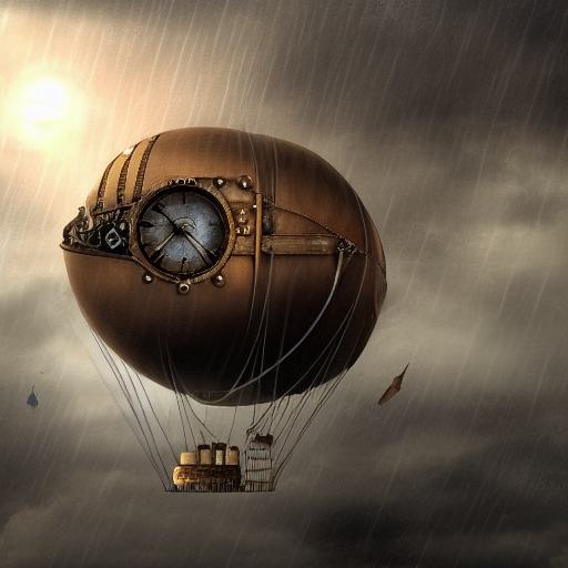 Detail steampunk art of a mechanical airship flying in the thunderstorm and raining