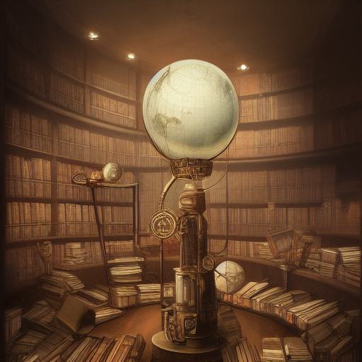 The prompt also includes a specific visual element, a mechanical globe in a library with many books on the floor. This specific detail provides a visual focal point for the image and helps to anchor it in a particular setting, in this case, a library. The use of the phrase “detailed steampunk illustration” also suggests that the image should be highly detailed and intricate, with many small components and intricate machinery.