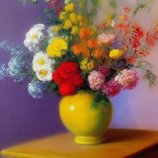 Painting of various flowers in a vase on a table