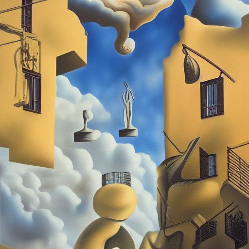 Painting on the side of a building with sculptures and sky