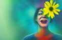 The woman in the psychedelic artwork is seen holding a laughing flower in ultra wide-angle view