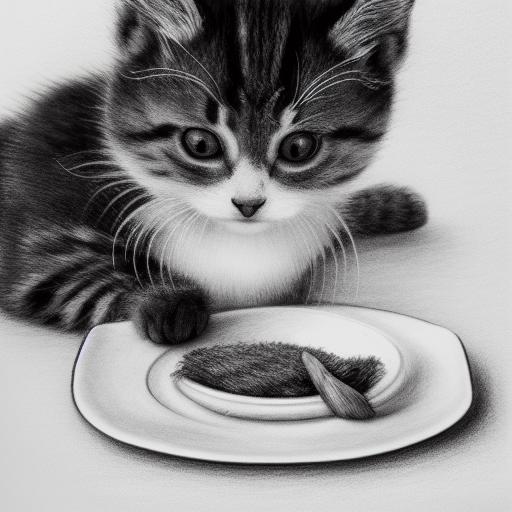 A black and white drawing of a kitten enjoying food