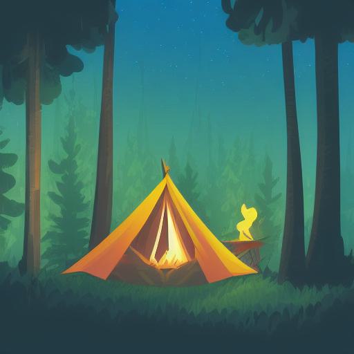 A camp in the middle of a forest with many trees at night