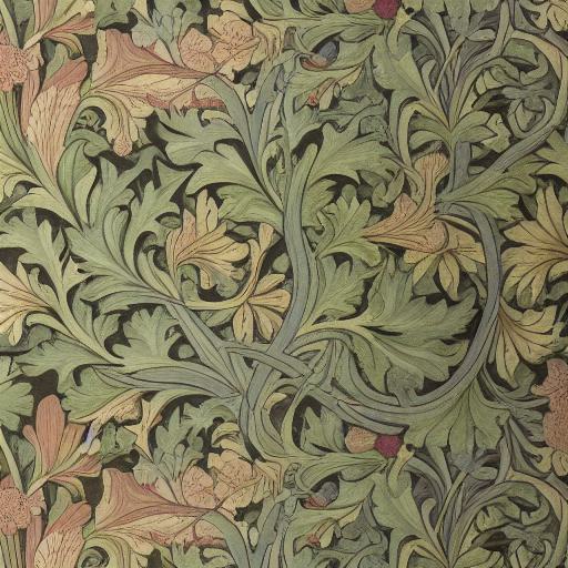 The keywords in the prompt “a close-up of a wallpaper with flowers and leaves, a digital rendering by William Morris, Arts and Crafts movement, William Morris style, style of William Morris print, Art Nouveau wallpaper” contribute to the creation of a specific artistic vision: