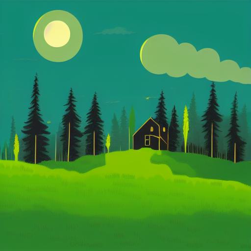 A green and black landscape with house and trees