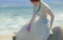 A joyful painting of a woman sitting on a rock by the ocean