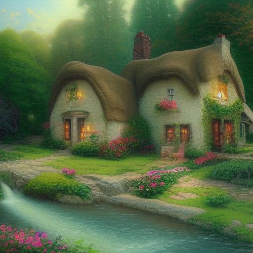 A painting of a cottage by a river with greenery