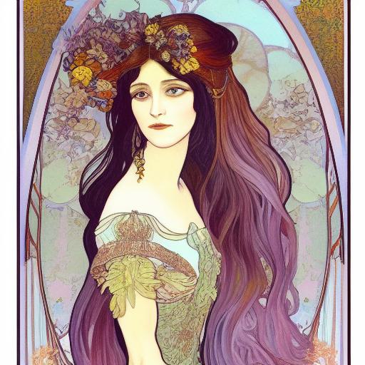 In the realm of art, where imagination knows no bounds, we can created a painting that unveils the elegance and allure of a woman with prompt and AI image generator such as Imagen and Midjourney. This particular artwork portrays a woman with flowing, long hair, gracefully adorned in a captivating long dress. Inspired by the iconic artist Alsphonse Mucha and the enchanting Art Nouveau movement, this painting transports us to a world of timeless beauty and artistic expression.