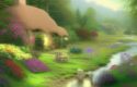 About A painting of cottage near a river with flowers